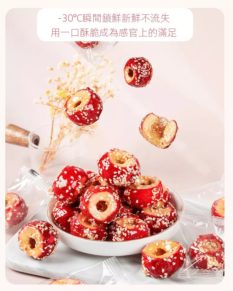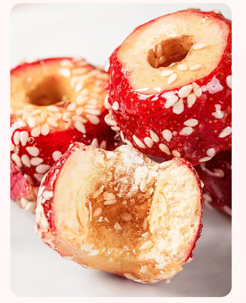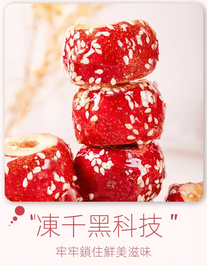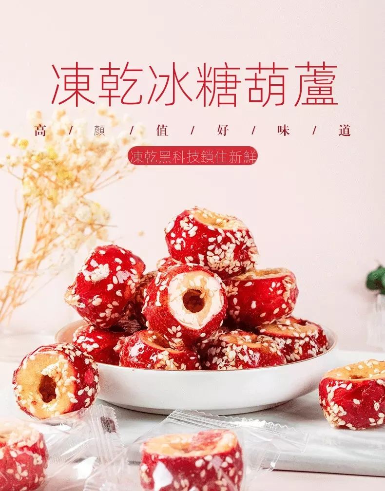 凍乾冰糖葫蘆中的山楂是無核的,含有豐富的微量元素與黃酮類的化合物,老北京蜜餞開胃零食推薦,採用FD凍干技術,保存完整的營養,一口嘎嘣脆,開胃又提神,好吃不怕胖。
